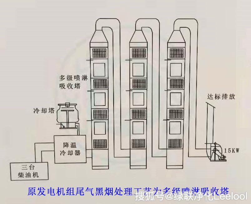 柴油發電機組尾氣原處理工藝為“三級水噴淋吸收塔”