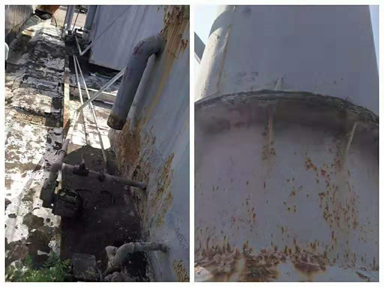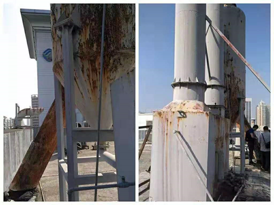 改造前樓頂兩臺旋流塔水噴淋處理設備銹蝕嚴重